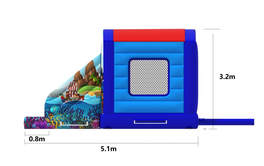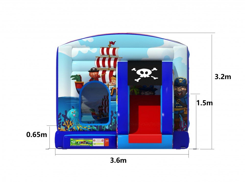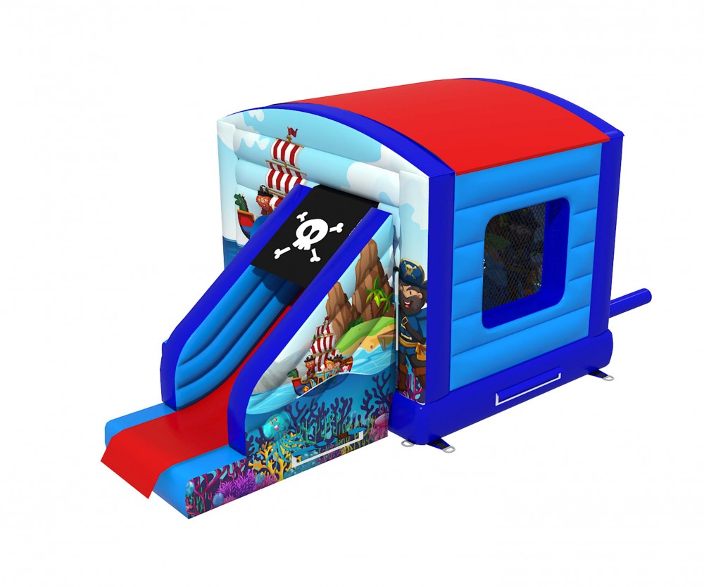 Betreed de wereld van piraten met ons piraten combo springkasteel met glijbaan en versierd met decoraties uit de onderwaterwereld. Geschikt voor in kleinere tuinen of plaatsen met een geringe beschikbare hoogte. Overdekt voor de warmste en de regenachtige dagen. Voeg een vleugje piratenmagie toe aan je feestje en maak van je evenement een onvergetelijk piratenavontuur.
