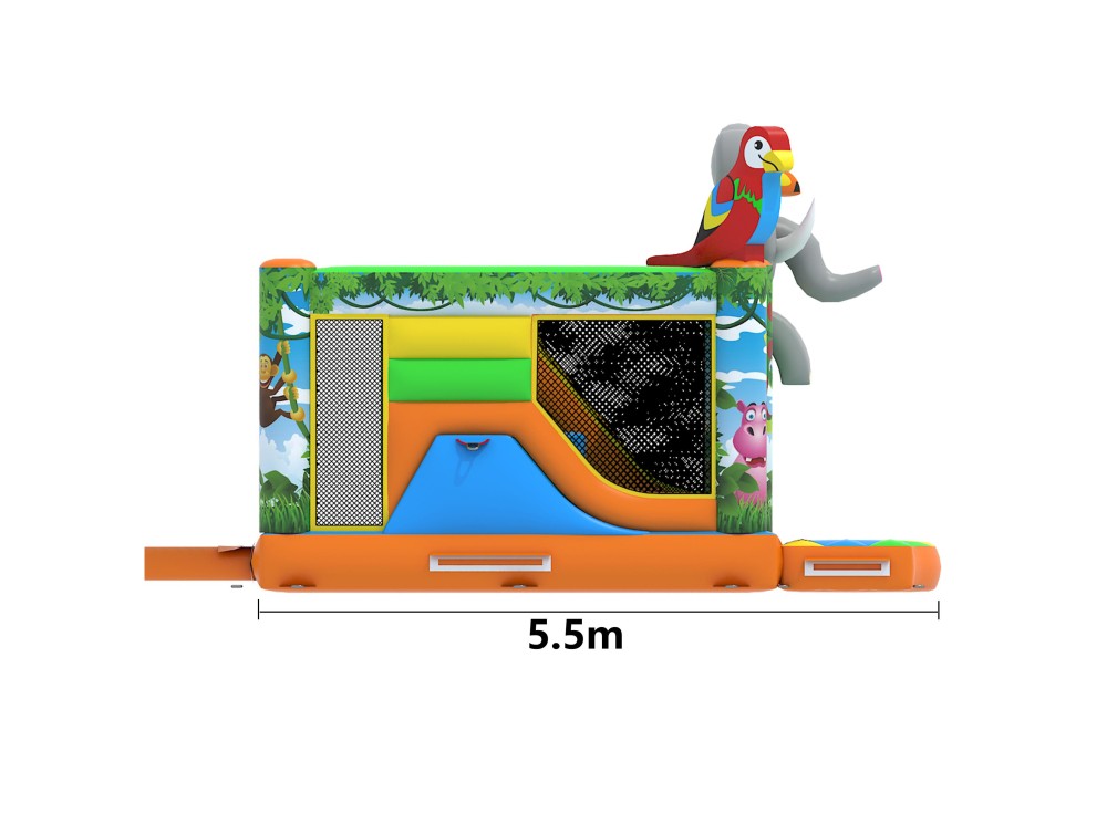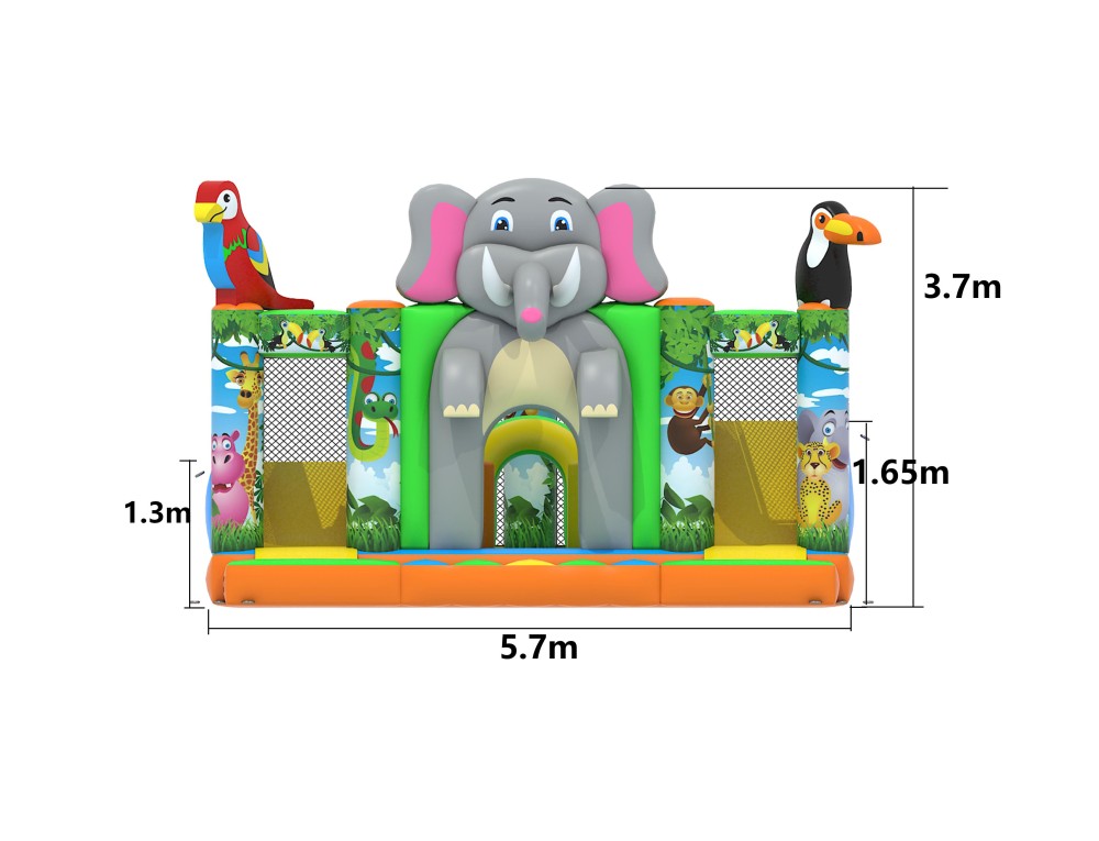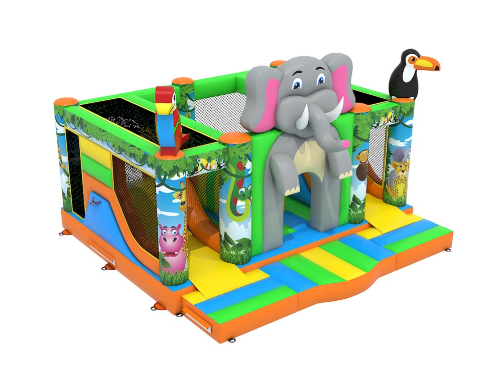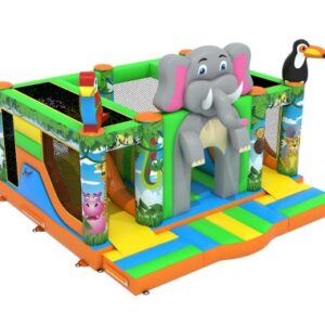 Dit kleurrijke springkasteel olifant biedt plaats aan 8 kinderen. Ook dit springkasteel is voorzien van 2 glijbanen zodat de kinderen aan glijplezier niets tekort komen. De zijkanten zijn voorzien van transparante netten waardoor ouders een glimp kunnen opvangen van de vreugde die zich binnenin afspeelt.