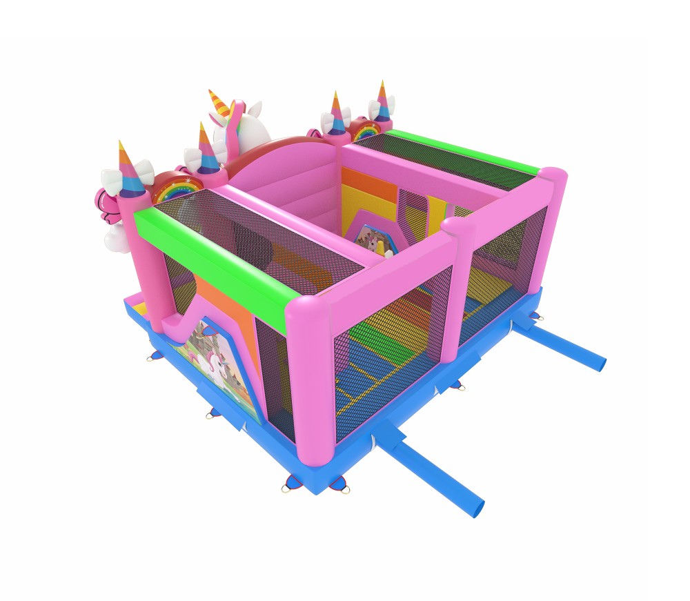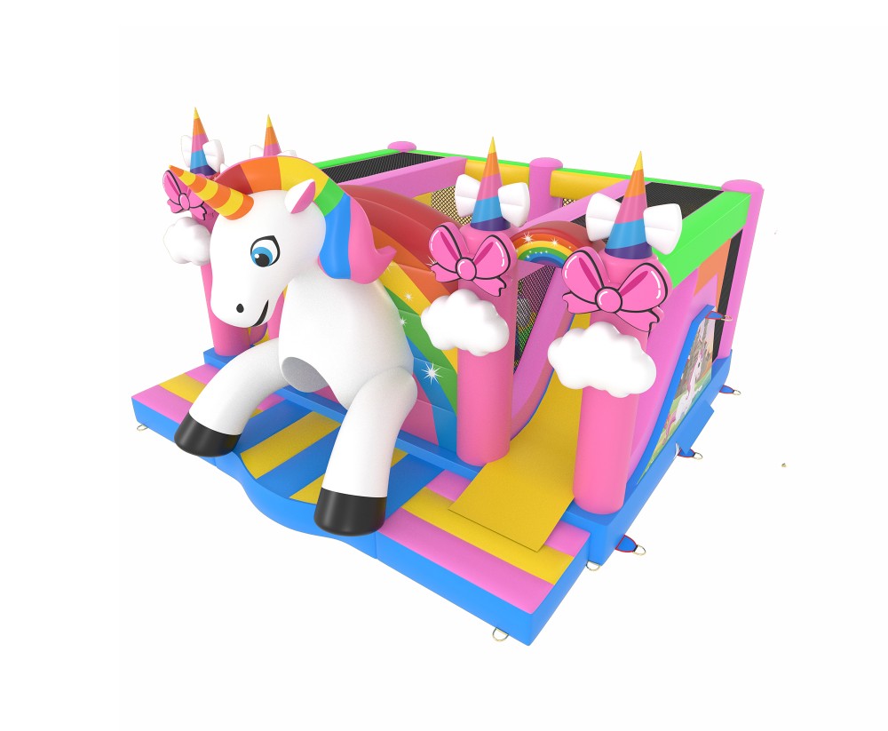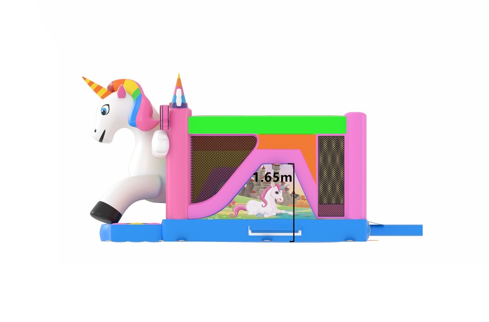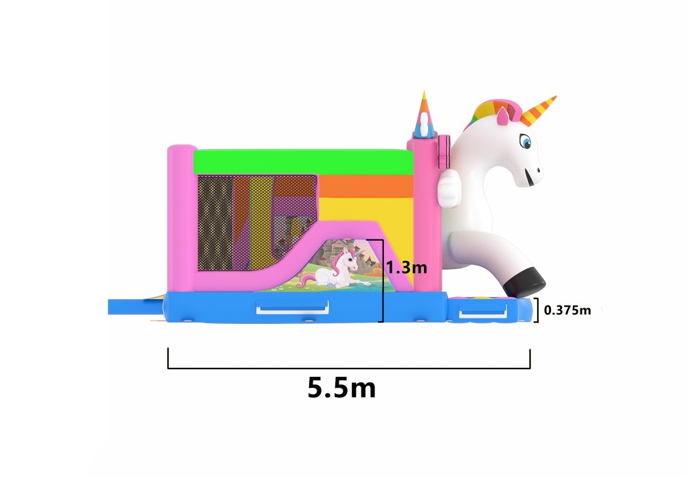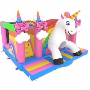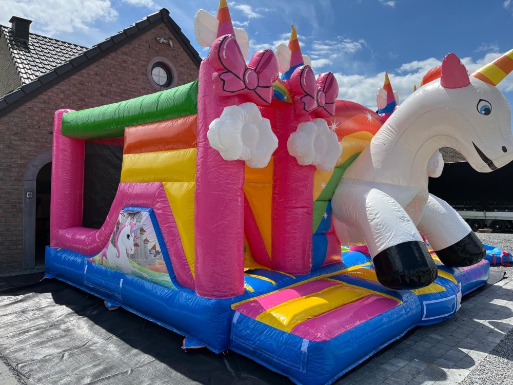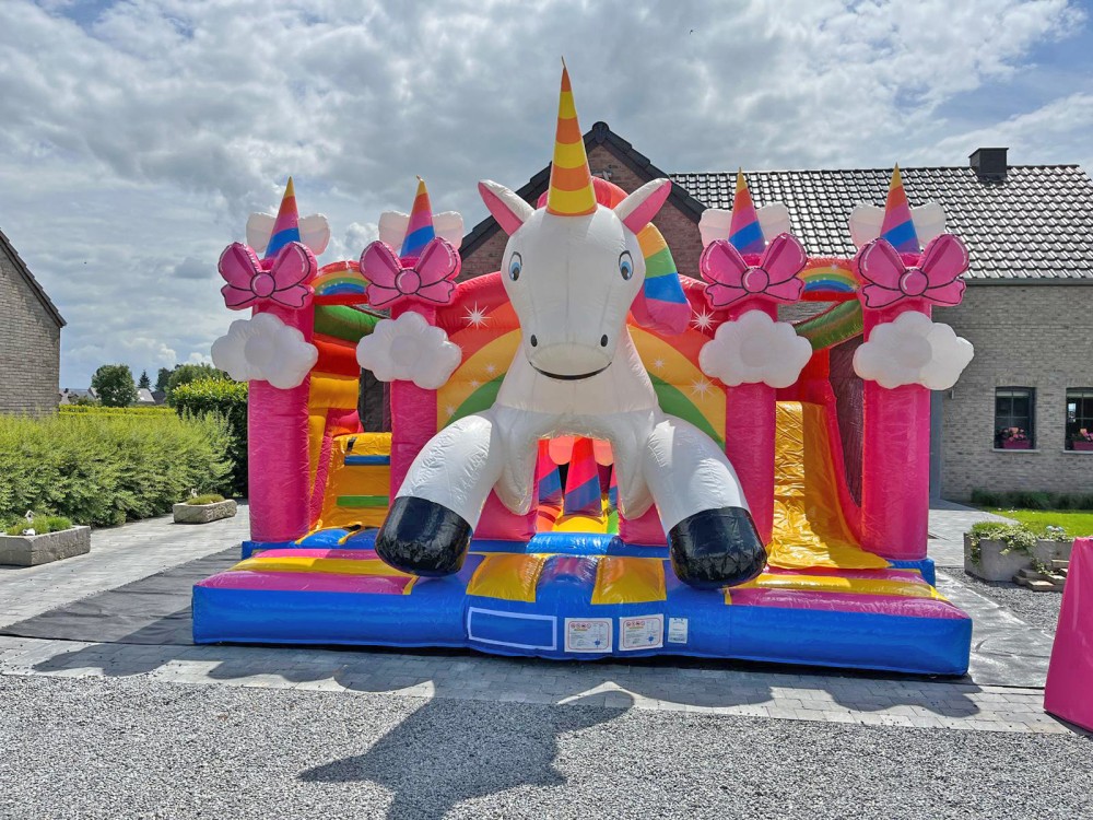 Stap binnen in een wereld vol fantasie en avontuur met het Eenhoorn springkasteel ! Dit kleurrijke luchtkasteel, versierd met prachtige regenbogen, een schattige eenhoorn en zachte wolkjes, is een magische plek waar kinderen hun dromen tot leven kunnen brengen. Het springkasteel heeft niet één, maar twee glijbanen van verschillende hoogtes. Elke glijbaan zorgt voor eindeloos speelplezier, en de afwisseling maakt het extra spannend voor de avontuurlijke kleintjes! Daarnaast zijn er diverse obstakels in het kasteel verwerkt, waar kinderen overheen kunnen klimmen of doorheen kunnen springen. Dit maakt het springkasteel niet alleen een plek voor plezier, maar ook voor uitdaging en beweging. Met dit eenhoorn-thema springkasteel wordt elke gelegenheid een betoverend feestje vol lachen, springen en onvergetelijke momenten!