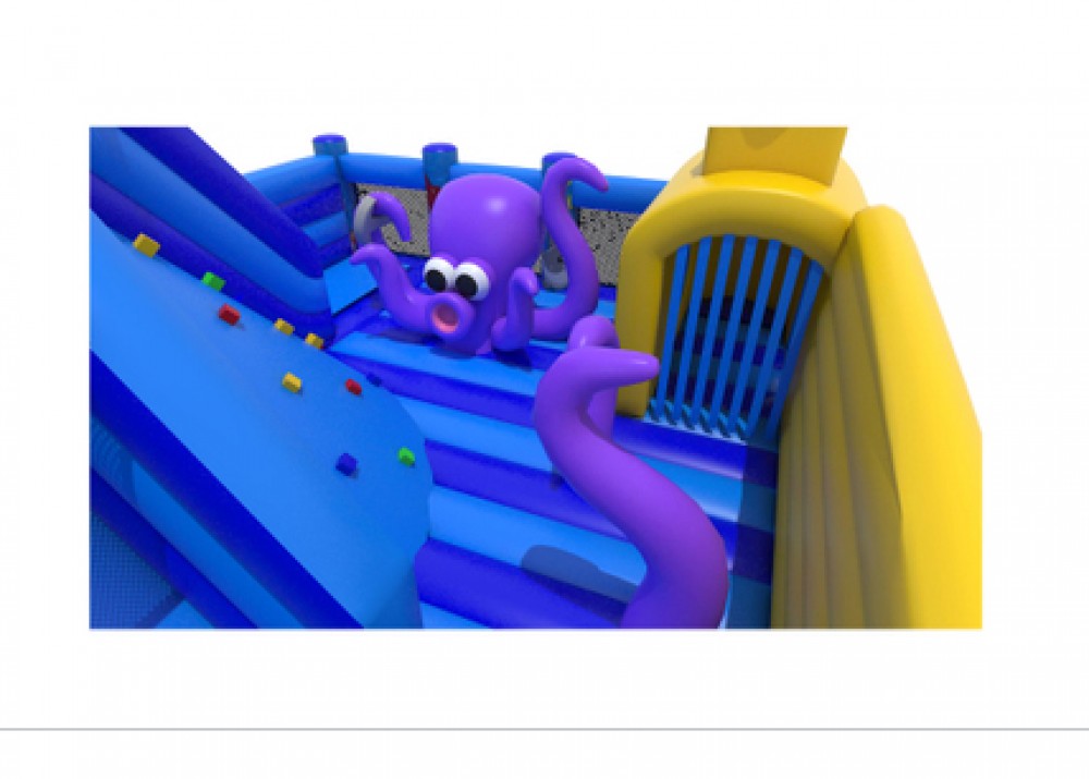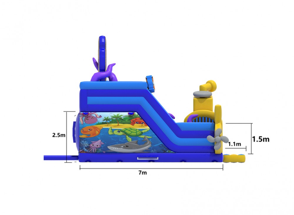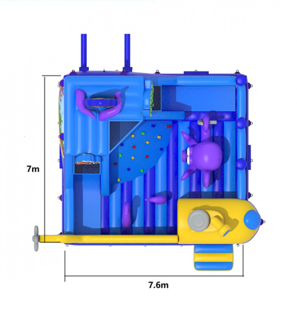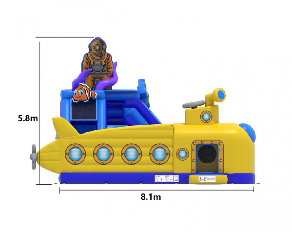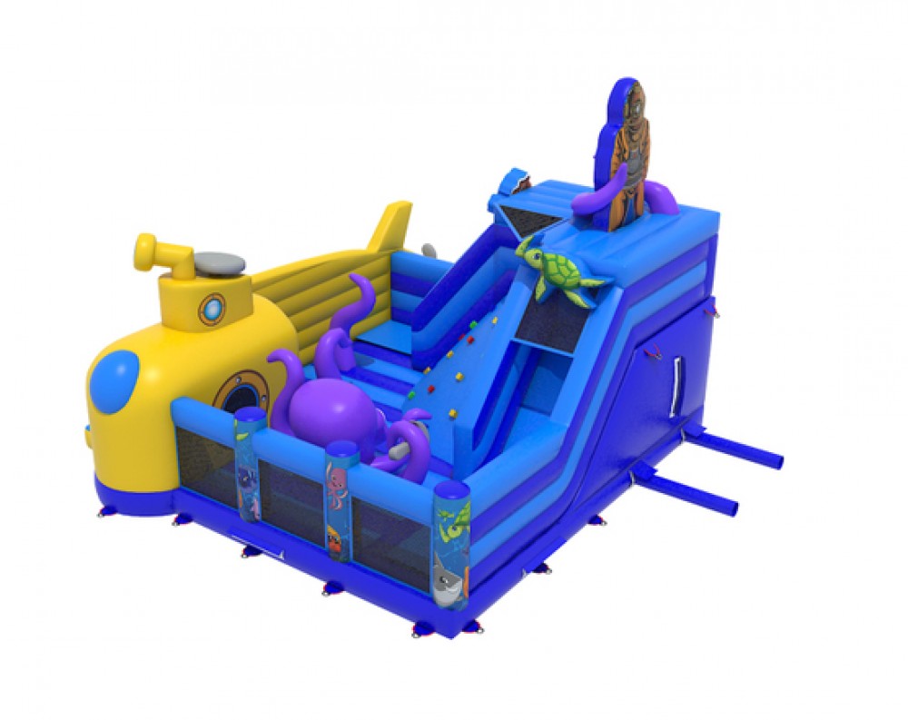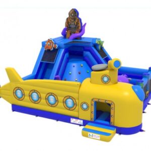 Duik diep in de pret en laat de verbeelding van kinderen tot leven komen met het gele duikboot springkasteel met klimmuur. Dit unieke springkasteel neemt kinderen mee op een onderwaterexpeditie vol opwinding en speelplezier. Klim als een moedige kapitein op de klimmuur en bereik het uitkijkpunt bovenaan. Een ware speelervaring die de kinderen meeneemt naar ongekende diepten van vreugde en avontuur. Origineel Dewit Events ontwerp.